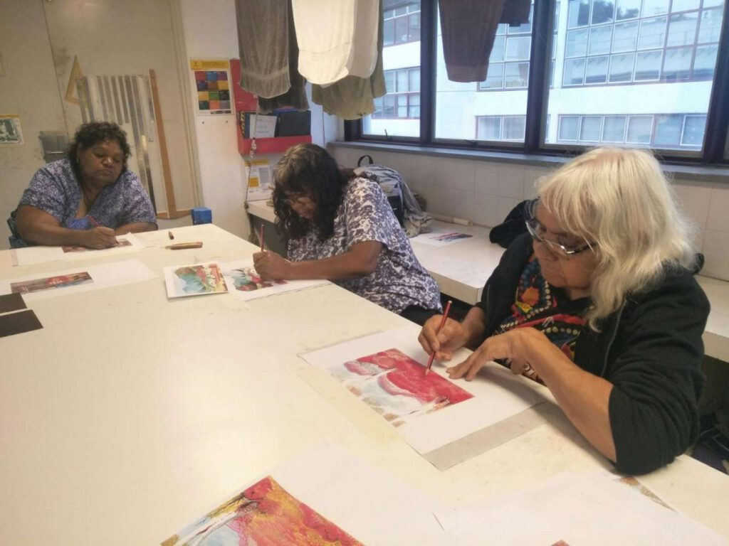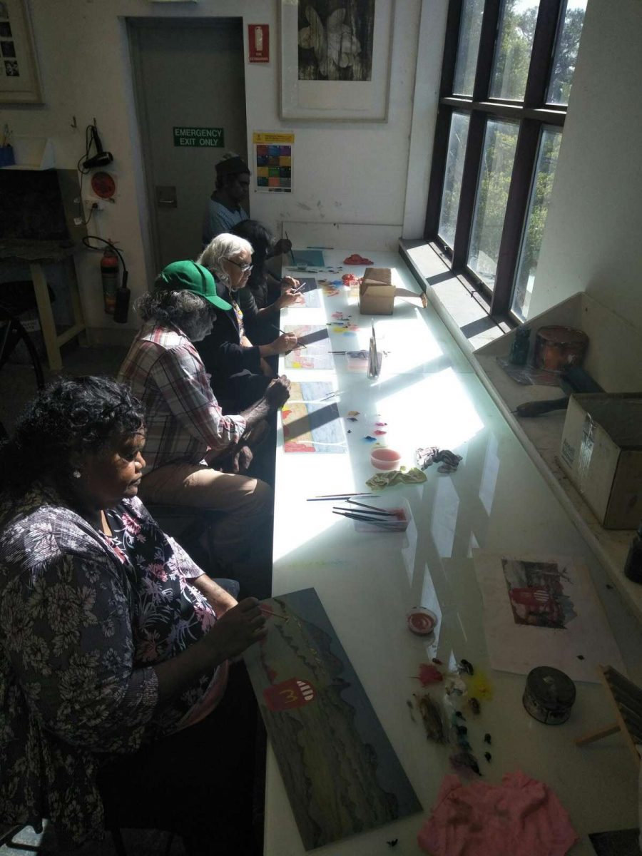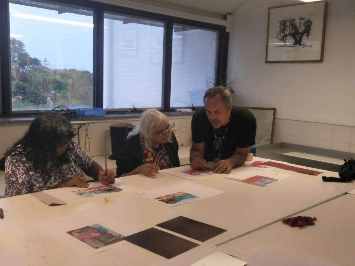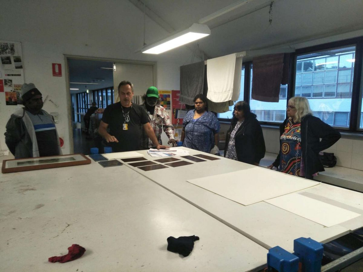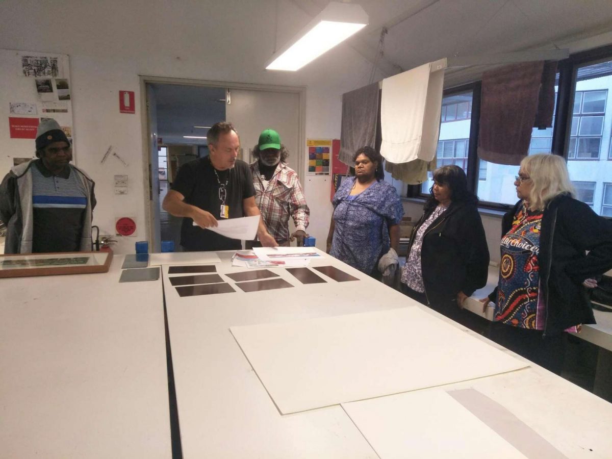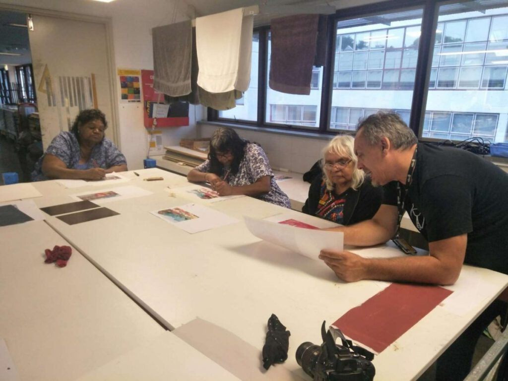 Seven Aboriginal artists attended an intensive week-long printmaking training with Cicada Press at UNSW in Sydney in 2019. The purpose of the training was to provide knowledge, skill, and new networks to emerging and senior artists.