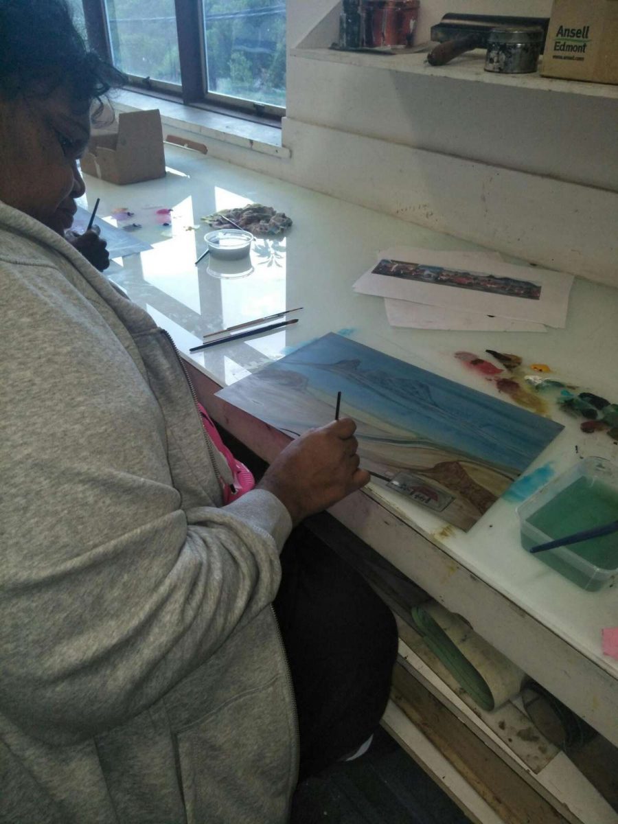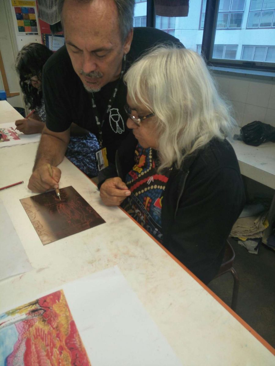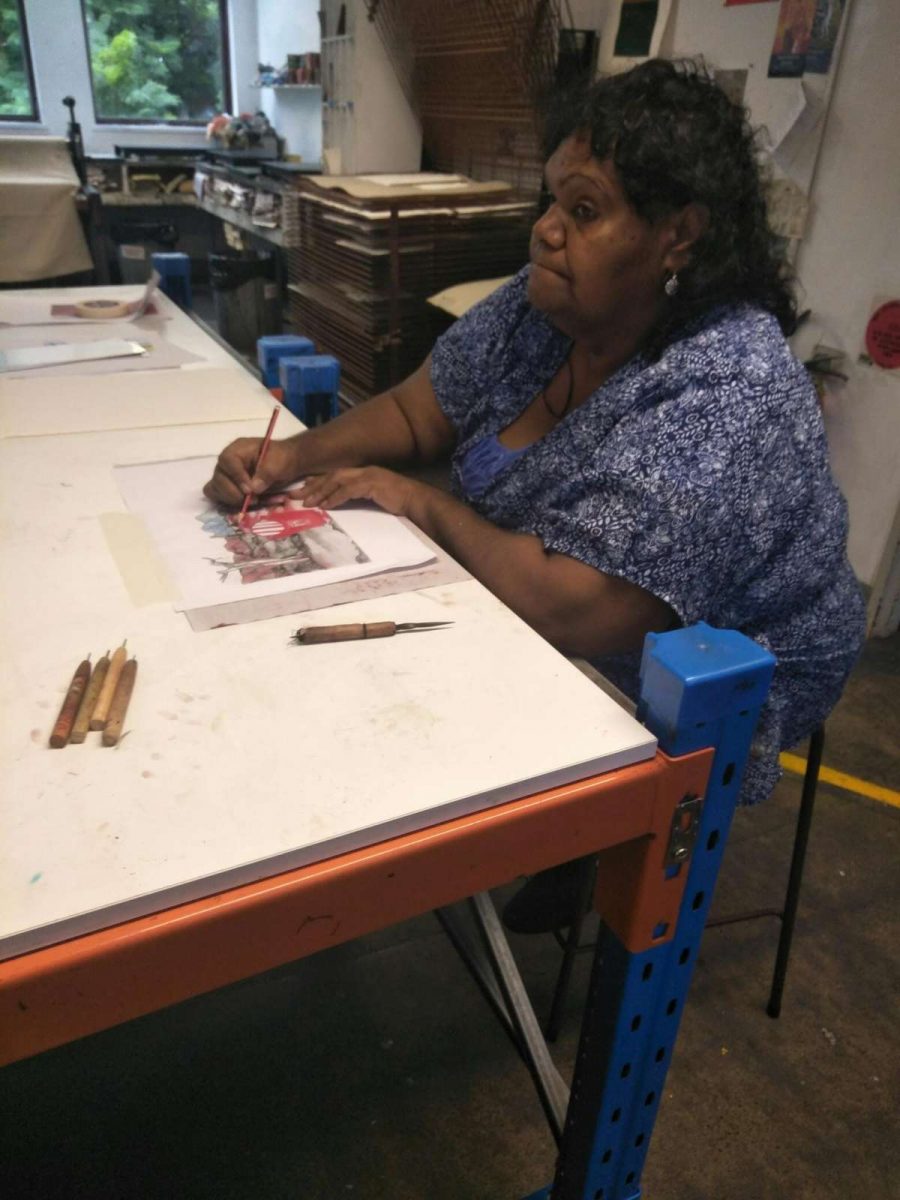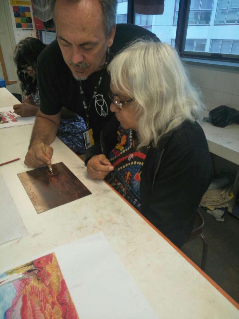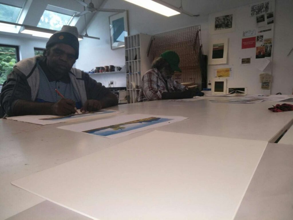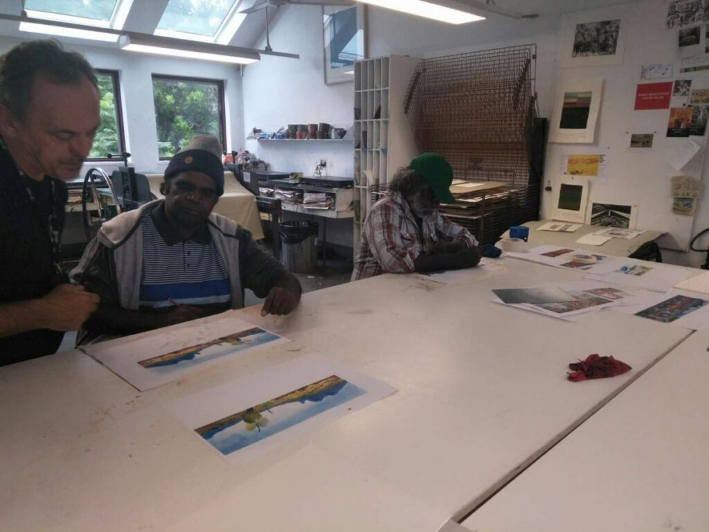 Seven Aboriginal artists attended an intensive week-long printmaking training with Cicada Press at UNSW in Sydney in 2019. The purpose of the training was to provide knowledge, skill, and new networks to emerging and senior artists.