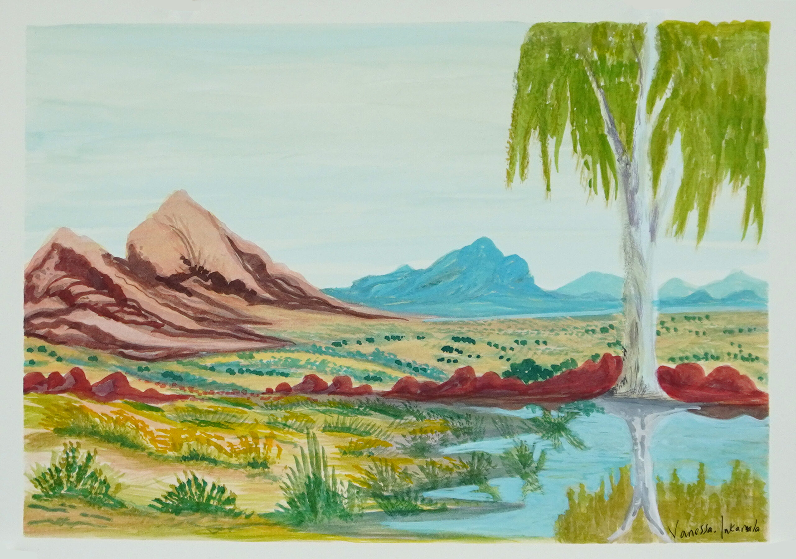 $410.00 Out of stock Tjoritja, morning time Catalog no. : 116-25 Artist name : Vanessa Inkamala (11 artworks) Category : Established artists Size : 26 x 36 cm Medium : watercolour on paper Status : Out of stock