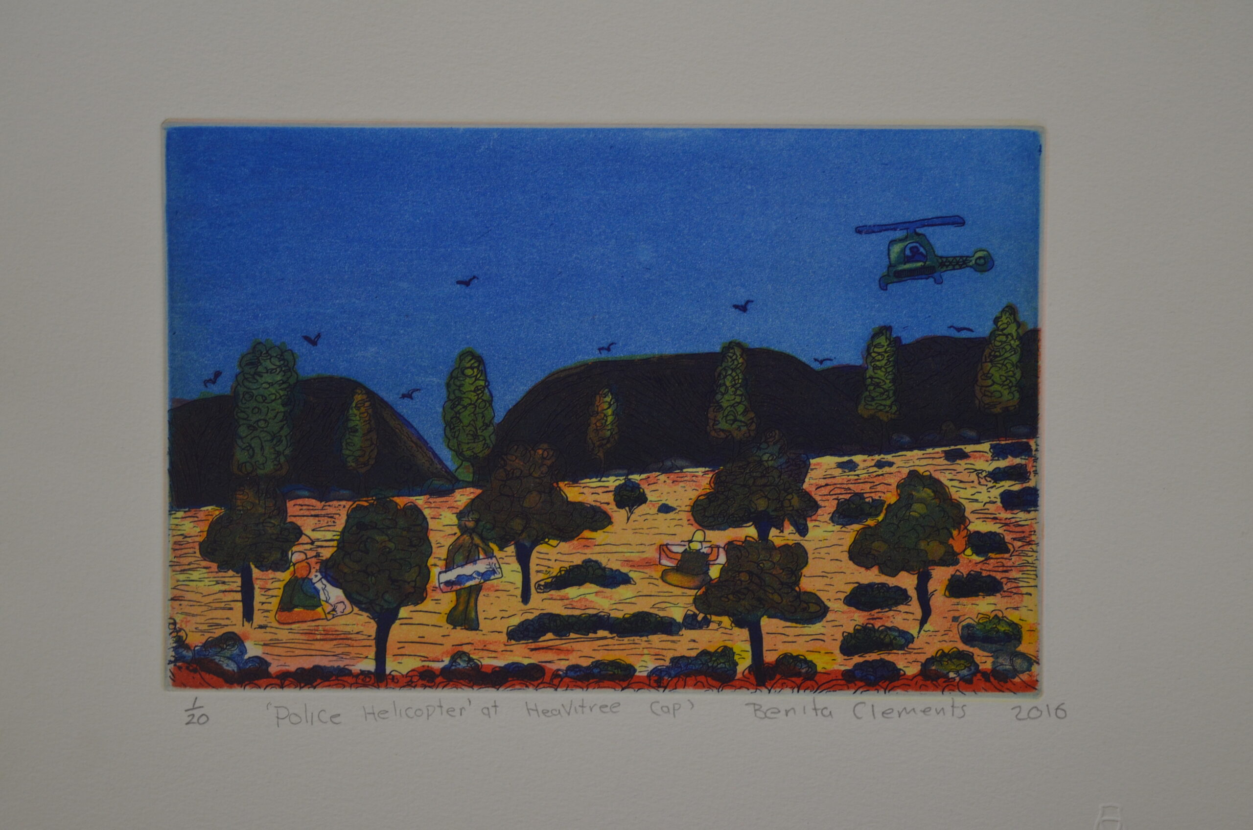 Artwork context navigation Shop > Prints > Artwork 5 of 5 $180.00 1 in stock Police Helicopter at Heavitree Gap quantity Add to cart Police Helicopter at Heavitree Gap Catalog no. : 133-17-19/20 Artist name : Mona Lisa Clements (10 artworks) Category : Prints Size : 16 x 24 cm multi plate etching Status : In stock Created in a professional development trip to Cicada Press in Sydney in 2017