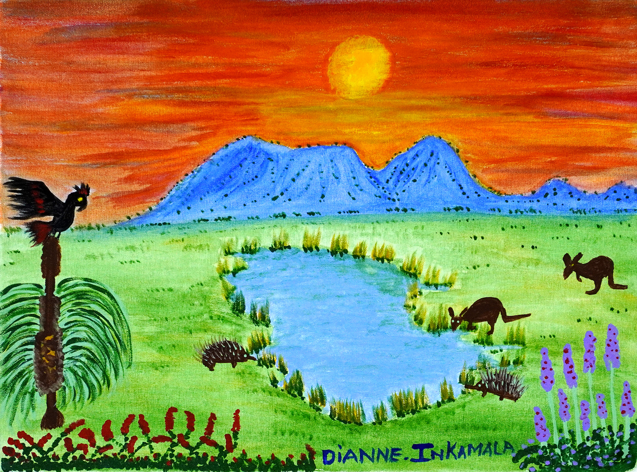 Artwork context navigation Shop > Canvas Paintings > Artwork 5 of 13 $430.00 1 in stock MacDonnell Ranges, after the rain quantity Add to cart MacDonnell Ranges, after the rain Catalog no. : 197-24 Artist name : Dianne Inkamala (13 artworks) Category : Canvas Paintings Size : 30 x 41cm Medium : Acrylic on Canvas Status : In stock New wild flowers, after the rain, Black cockatoos, kangaroos and echidnas drinking swamp water.