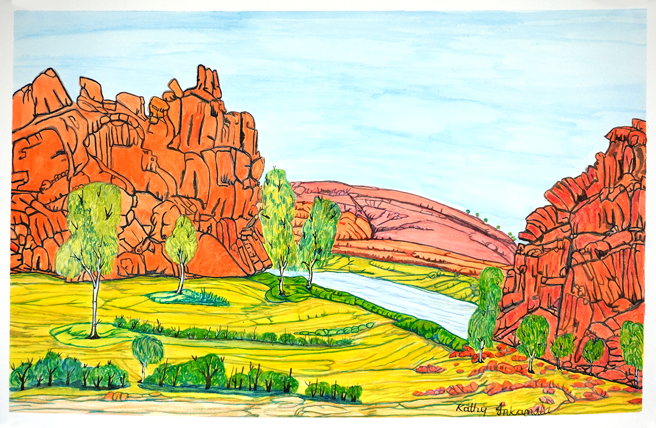 $850.00 1 in stock Glen Helen quantity Add to cart Glen Helen Catalog no. : 197-25 Artist name : Kathy Inkamala (11 artworks) Category : Established artists Size : 36 x 54cm Medium : watercolour on paper Status : In stock