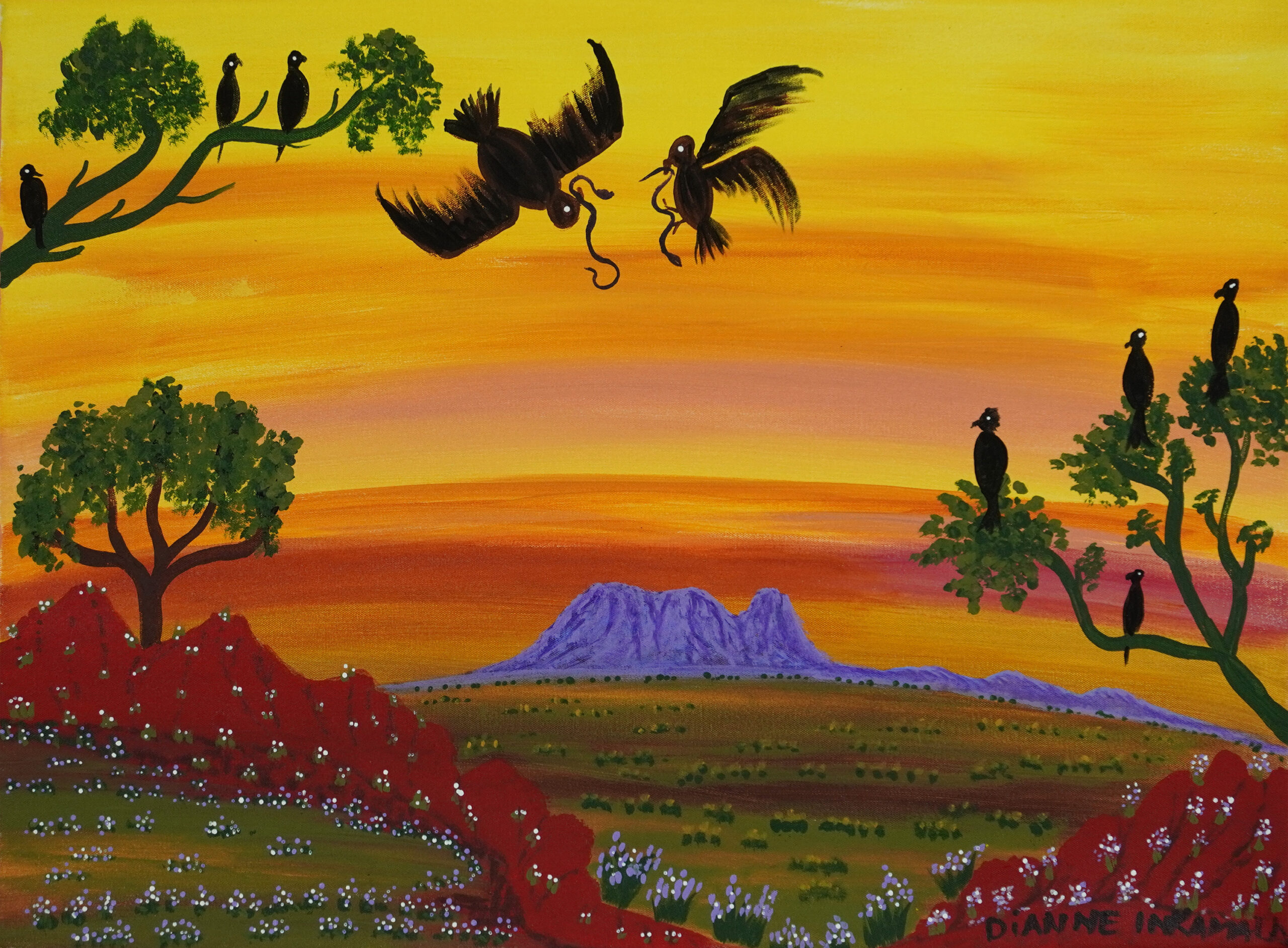 $450.00 1 in stock Tjoritja at Sunset quantity Add to cart Tjoritja at Sunset Catalog no. : 292-24 Artist name : Dianne Inkamala (13 artworks) Category : Canvas Paintings Size : 41 x 56cm Medium : Acrylic on Canvas Status : In stock Wild flowers are growing after the rain and that makes the birds happy. In the distance you can see Mount Sonder, my father’s country