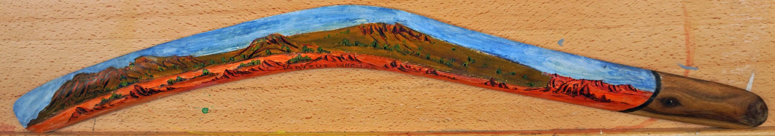 $1,200.00 1 in stock Tjoritja (West MacDonnell Ranges) , NT quantity Add to cart Tjoritja (West MacDonnell Ranges) , NT Catalog no. : 302-22 Artist name : Marcus Wheeler (17 artworks) Category : Size : 5.5 x 62 x 15 cm Medium : Watercolour pigment on Mulga wood (Acacia aneura) boomerang Status : In stock