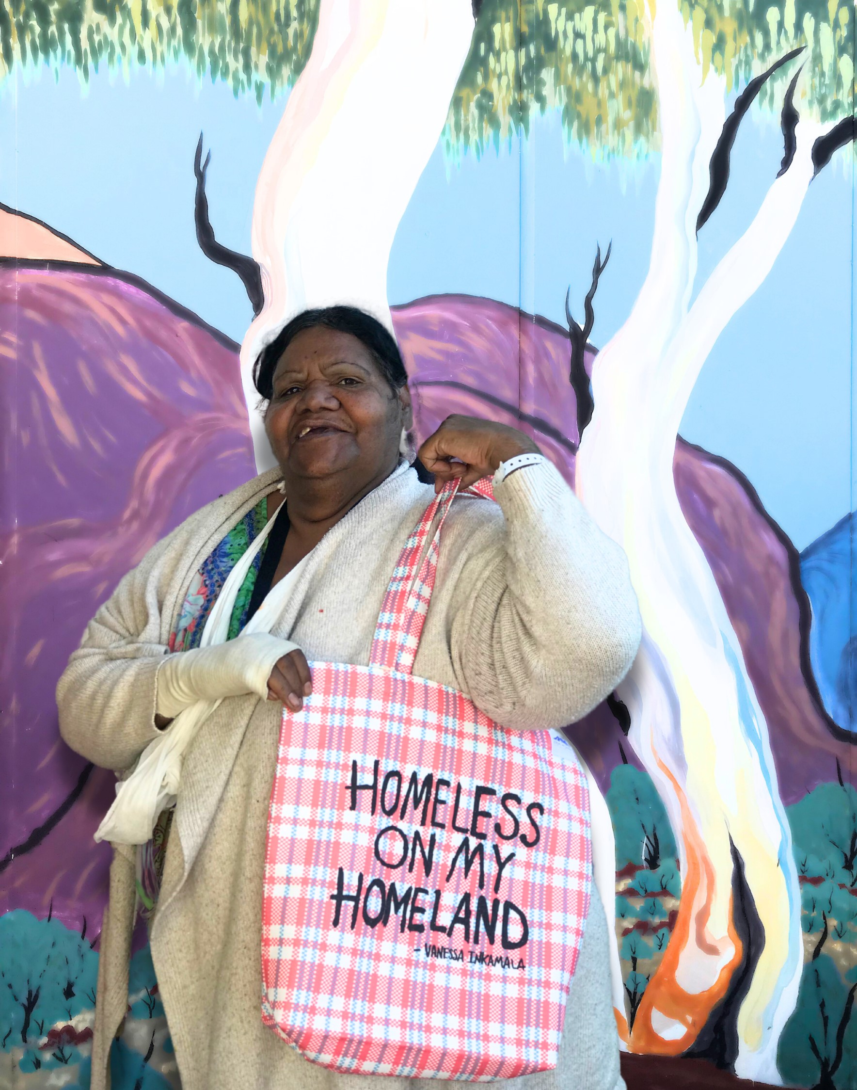 This tote bag represents a tangible collaboration involving renowned artists Tony Albert, Vanessa Inkamala, and the Iltja Ntjarra Art Centre. One side bears the impactful artwork “Homeless on my homeland,” part of a series of 14 bags commissioned for the 2020 Biennale of Sydney to make a bold statement on precarity, homelessness, and Indigenous land justice. On the reverse side, “before and after,” originally an etching created in collaboration with Cicada Press and Tony Albert in 2016, has been revised for this tote bag, unfolding a visual narrative portraying the environmental consequences of corporate exploitation of natural resources.